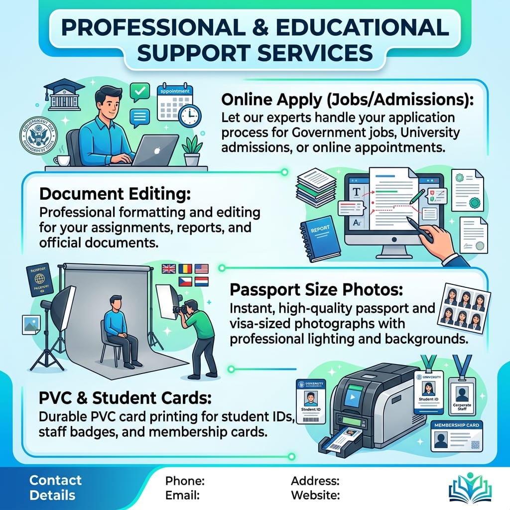Online Apply (Jobs/Admissions): Let our experts handle your application process for Government jobs, University admissions, or online appointments.